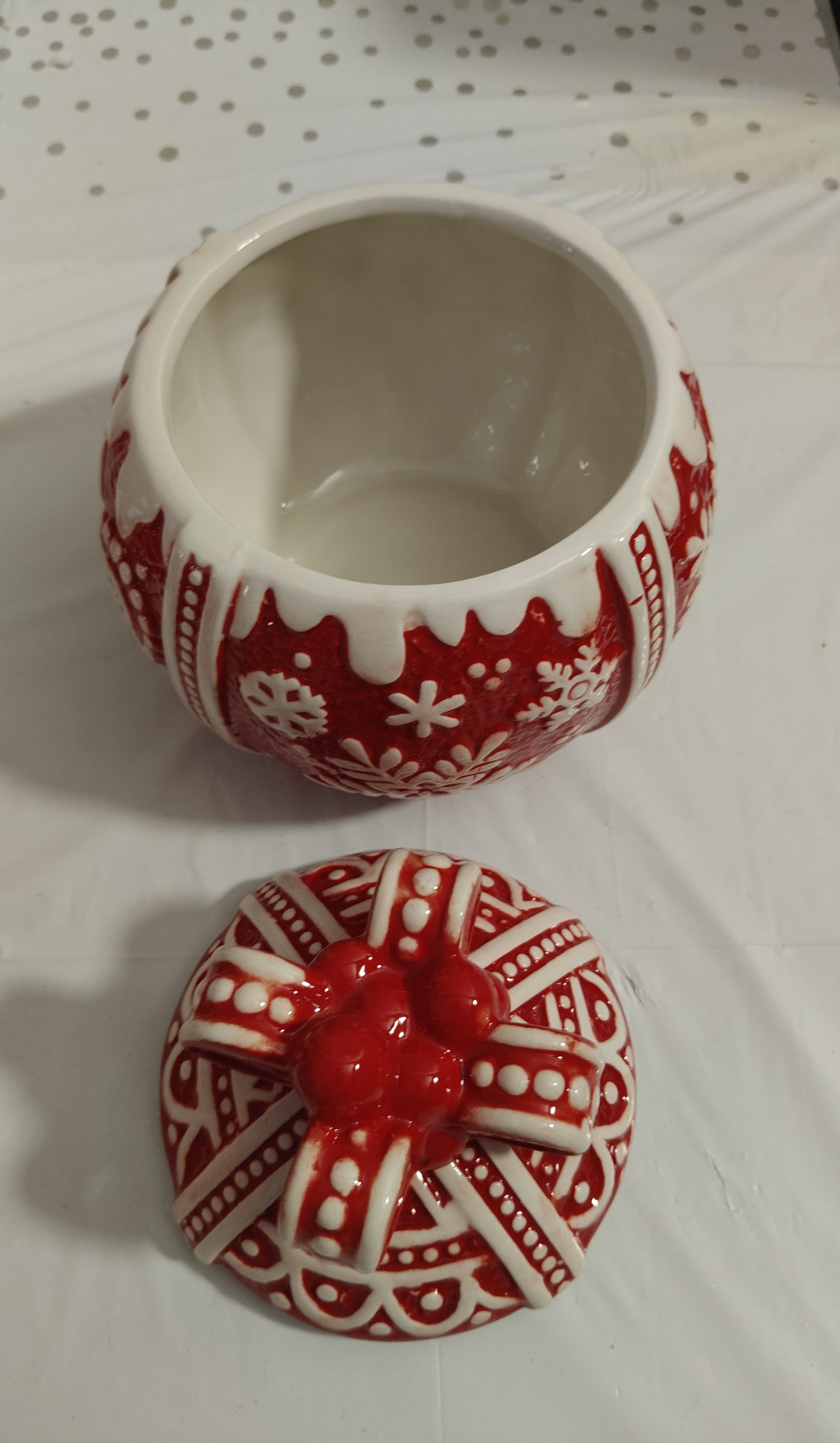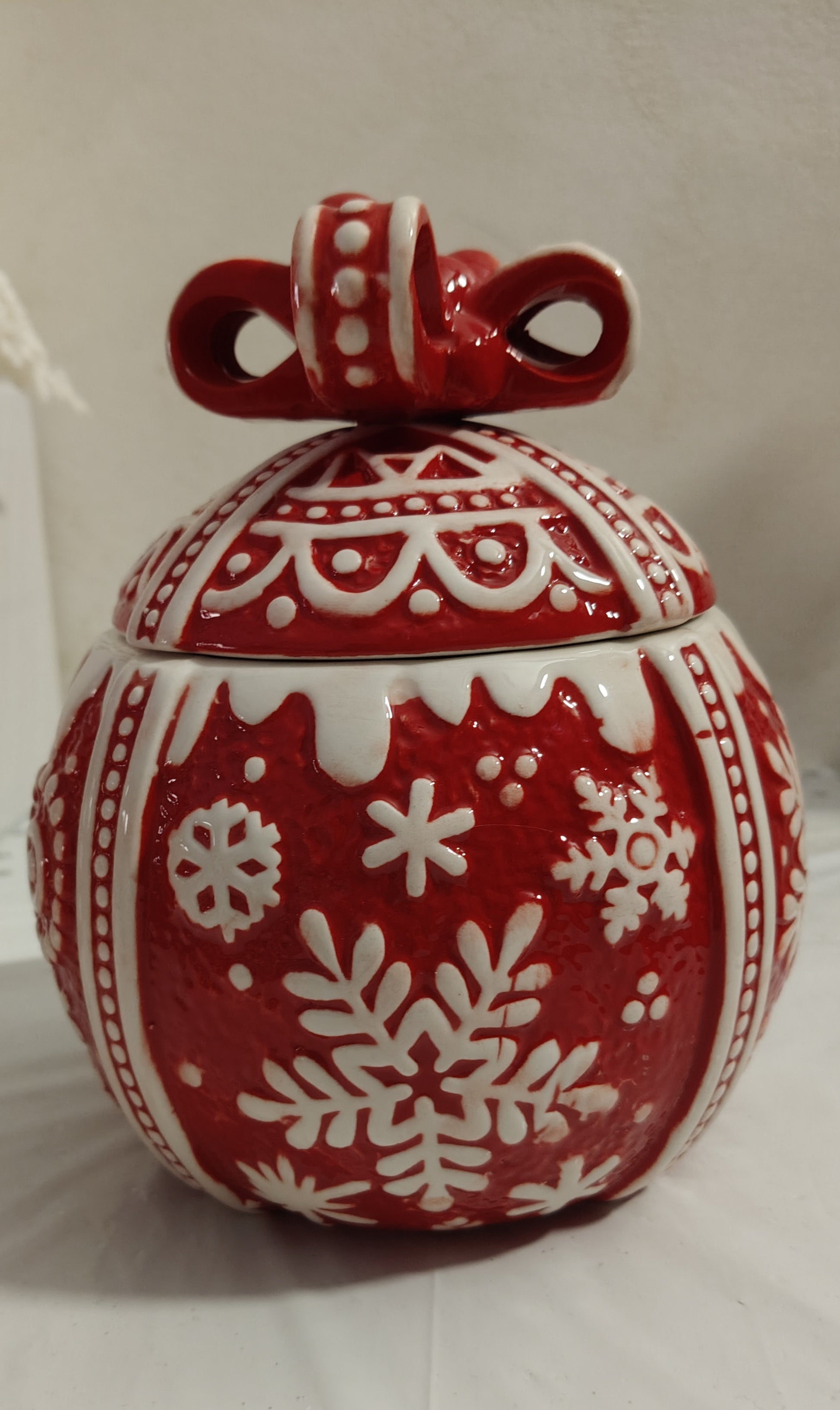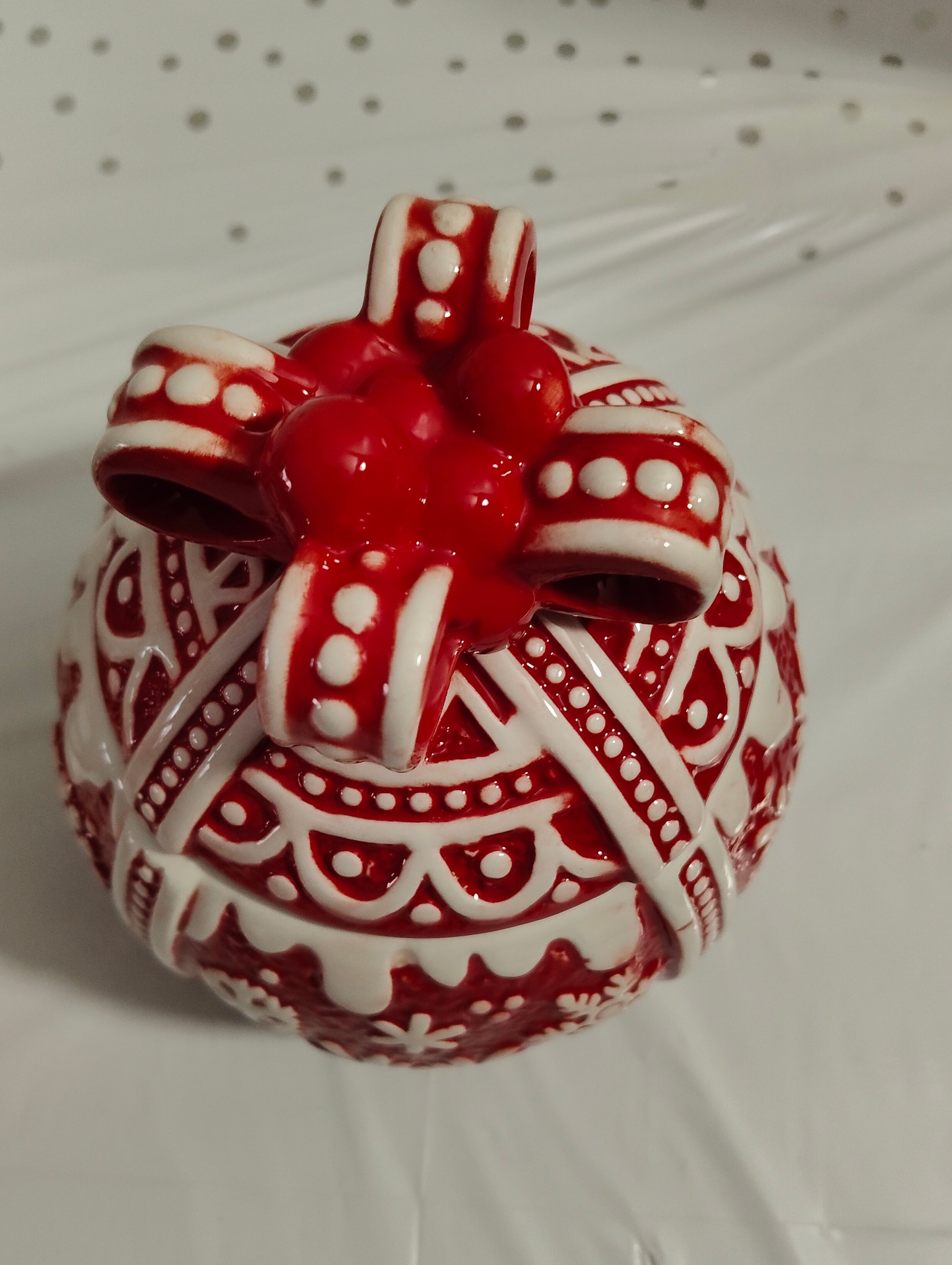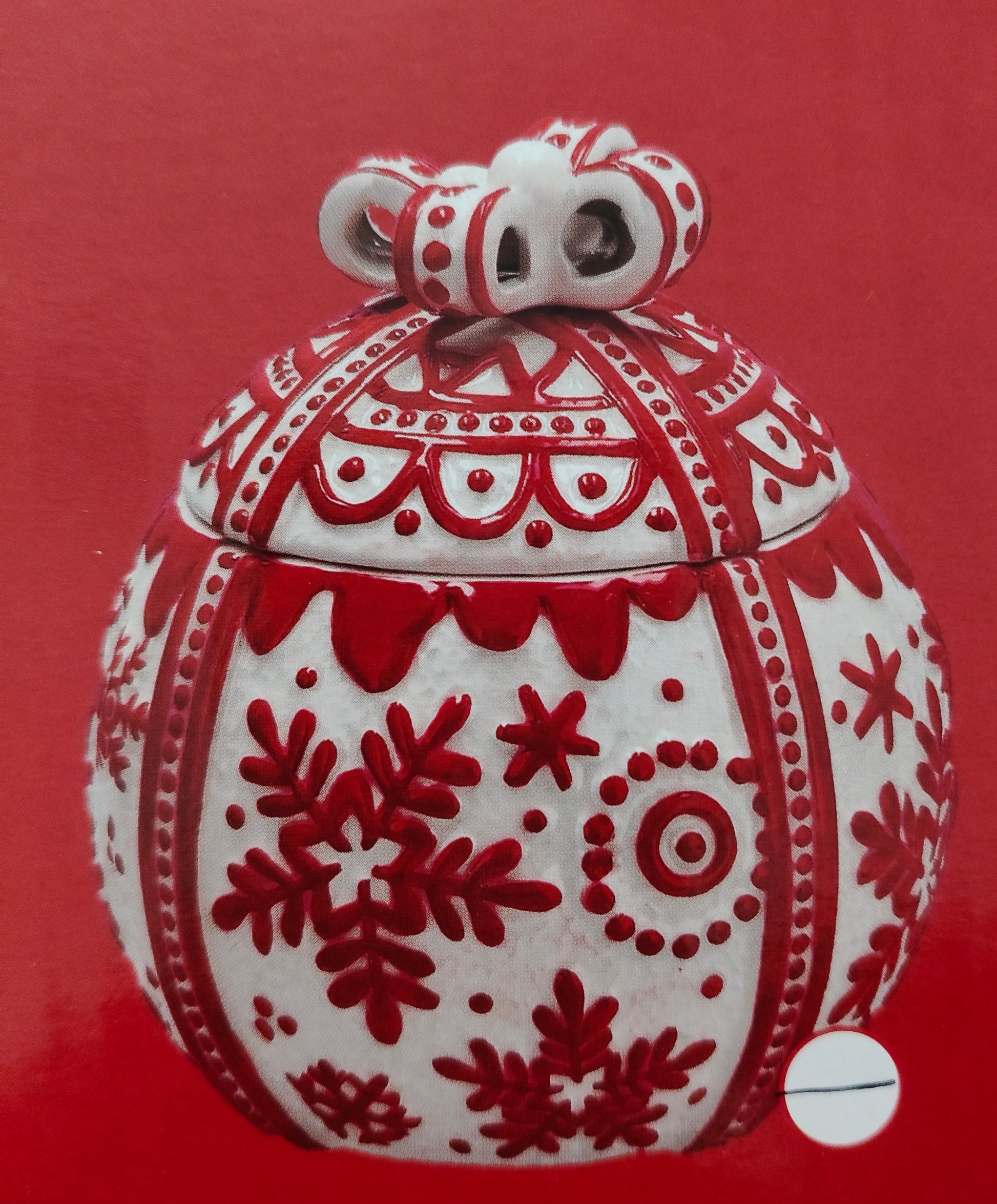 Porta la magia delle feste nella tua casa con questa splendida biscottiera in ceramica a forma di palla natalizia. Realizzata nei classici colori rosso e bianco, con dettagli eleganti e finitura lucida, è perfetta per conservare biscotti, caramelle o dolcetti natalizi e per decorare con stile la tua cucina o il tavolo delle feste.