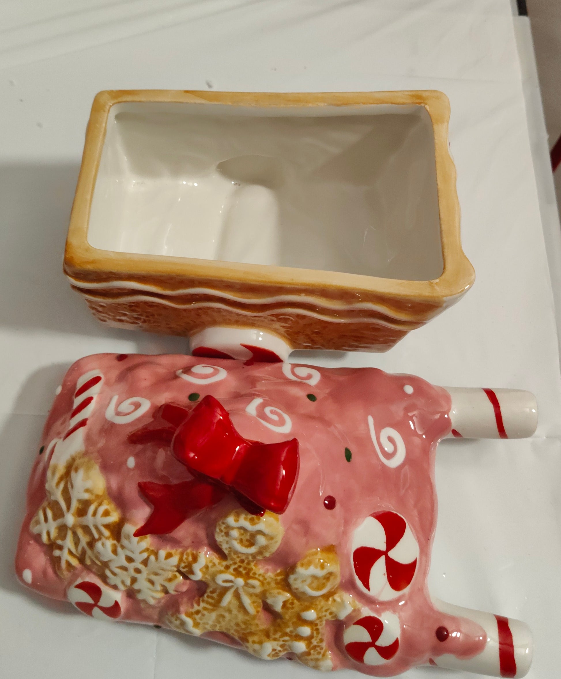 Aggiungi un tocco di dolcezza e stile alla tua cucina con questa splendida biscottiera a forma di carrettino in ceramica, dipinta nei toni delicati del rosa e del bianco.