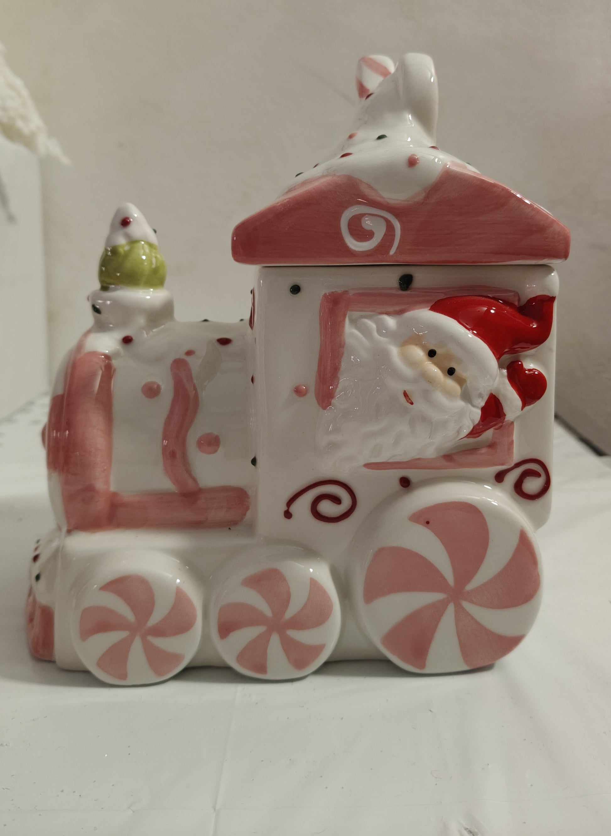 Porta la magia del Natale sulla tua tavola con la nostra biscottiera natalizia a forma di treno rosa e bianco!