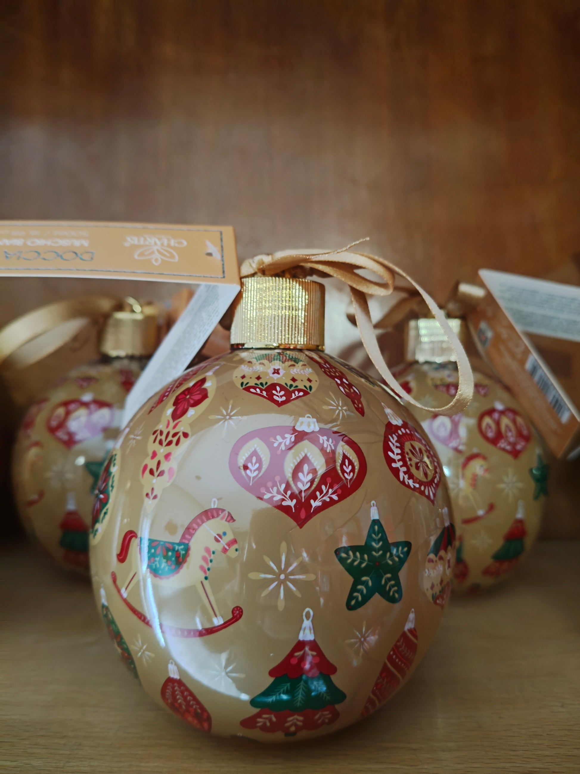 Dal design elegante e festoso, questa sfera decorativa racchiude un bagnoschiuma profumato da 500 ml, disponibile nei classici colori verde, rosso o oro.