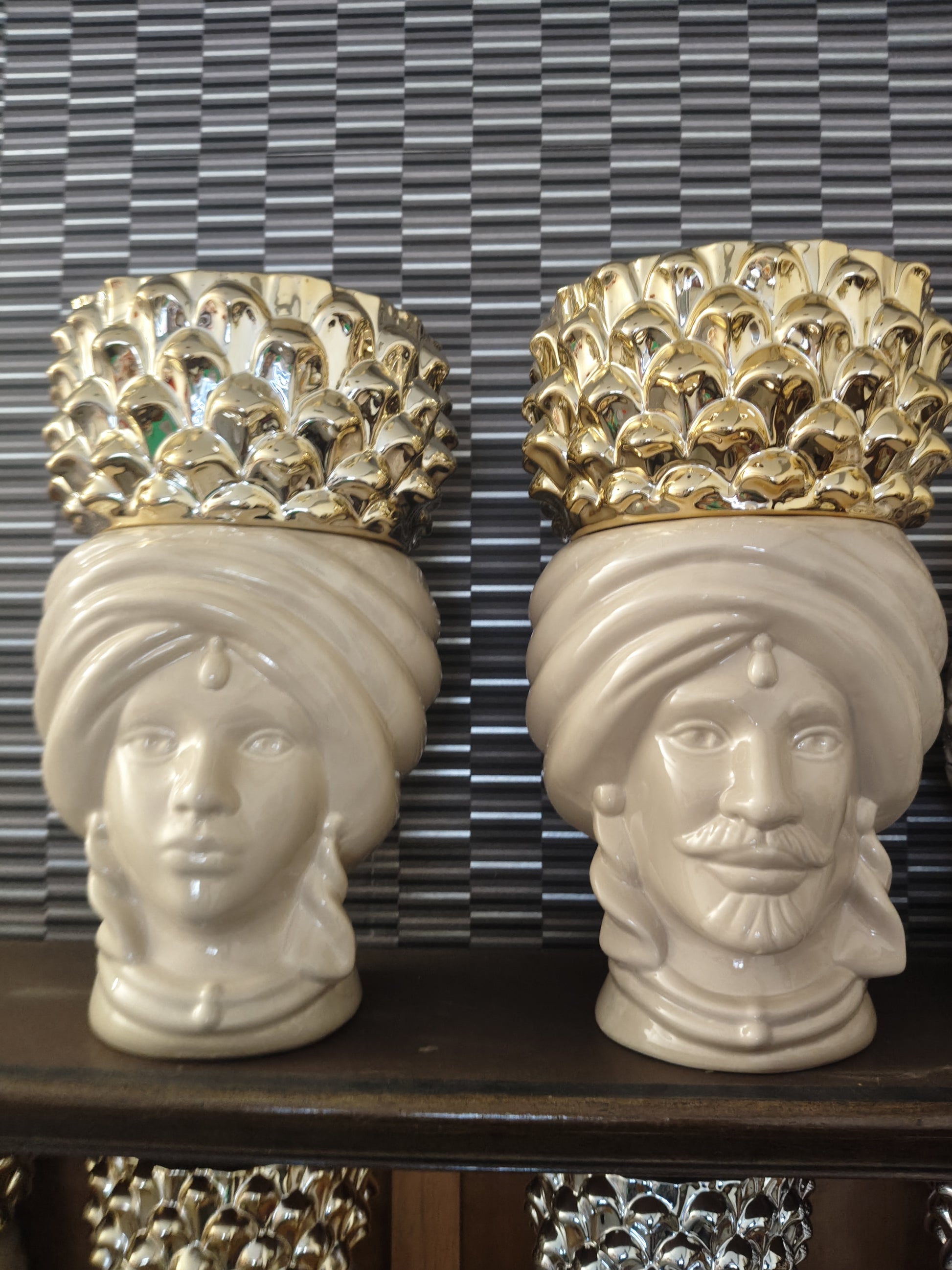 Questo prodotto presenta teste di moro realizzate in ceramica beige. La decorazione con pigna oro aggiunge un tocco di eleganza. Le dimensioni del prodotto sono di 42 cm. Perfetto per decorazioni interne o esterne.