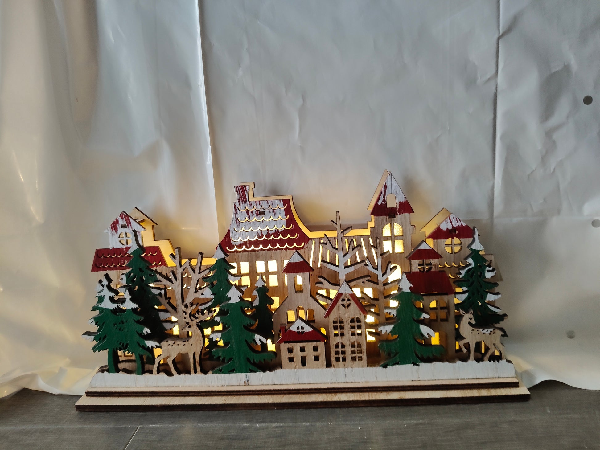 Crea un’atmosfera magica e accogliente con questo piccolo villaggio natalizio in legno intagliato, decorato nei tradizionali colori verde, rosso e legno naturale. Illuminato da una soffice luce LED calda, dona un tocco di calore e tradizione a qualsiasi ambiente della casa.